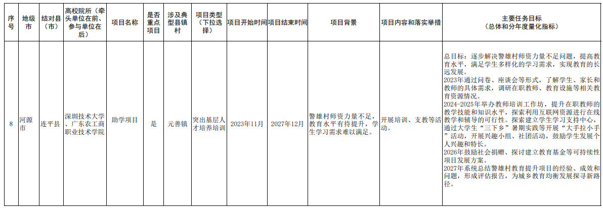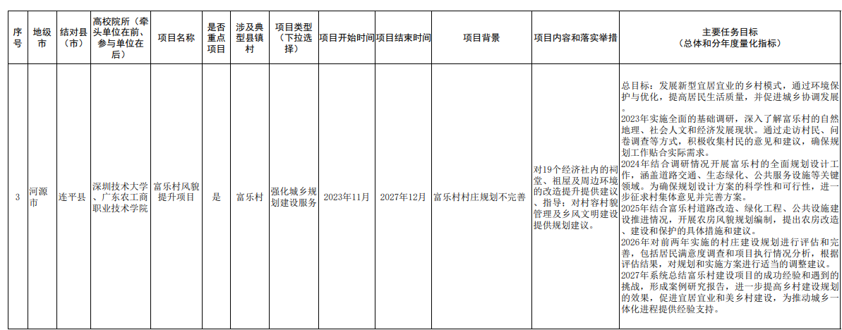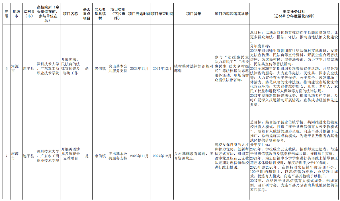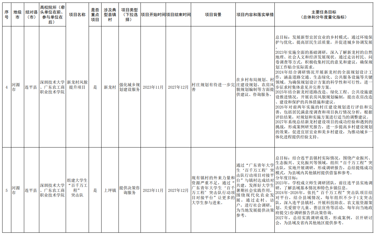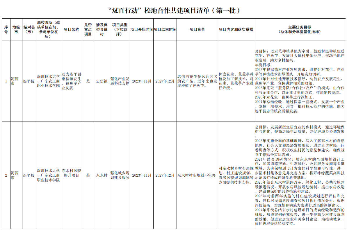 根据《广东省“百县千镇万村高质量发展工程”指挥部“双百行动”专班办公室关于做好<“双百行动”校地合作共建项目清单(第一批)>有关工作的通知》等要求,我校与河源市连平县、汕尾市陆河县反复沟通协商,并经学院、相关部门深入调研论证,制定了“双百行动”第一批校地合作共建项目清单,现将共建项目清单予以公开发布。